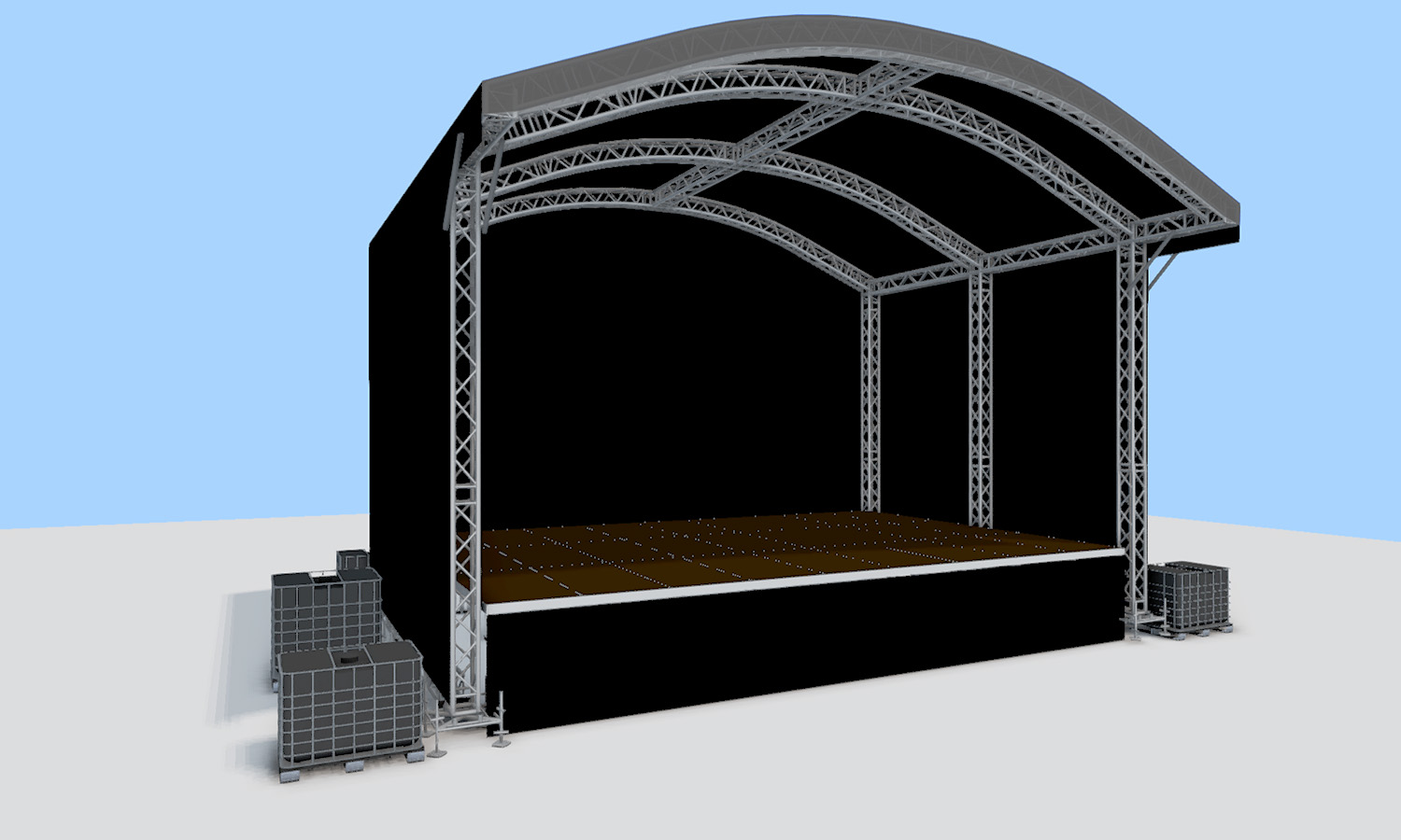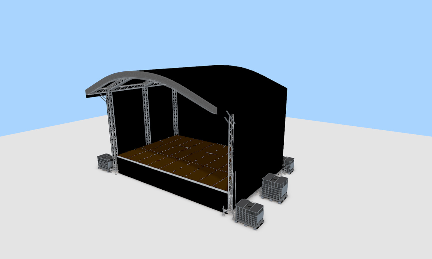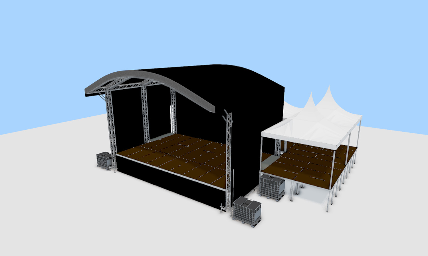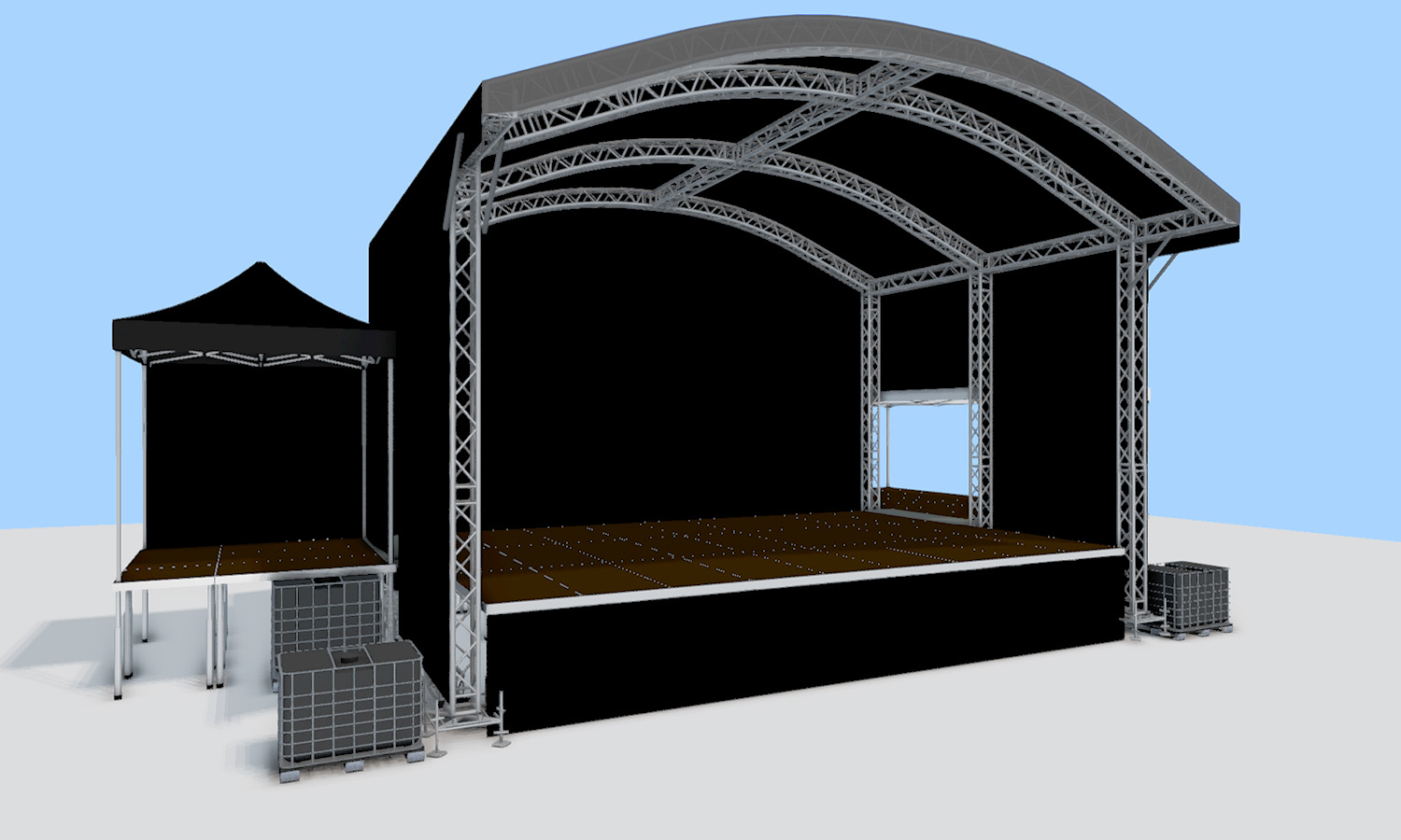 Het podium is optioneel te bestellen met backstageruimte en monitor-uitbouw.