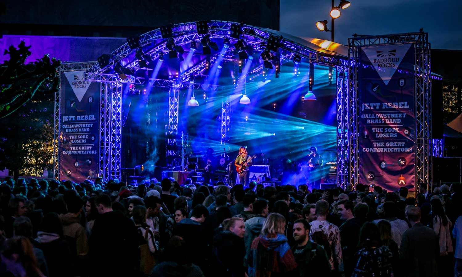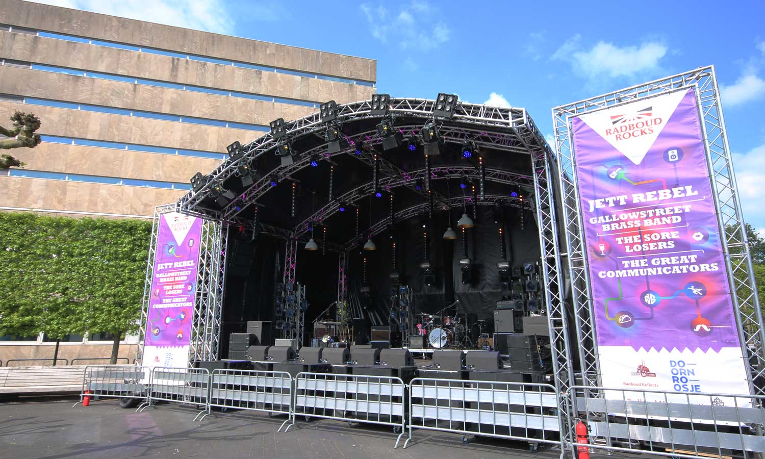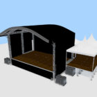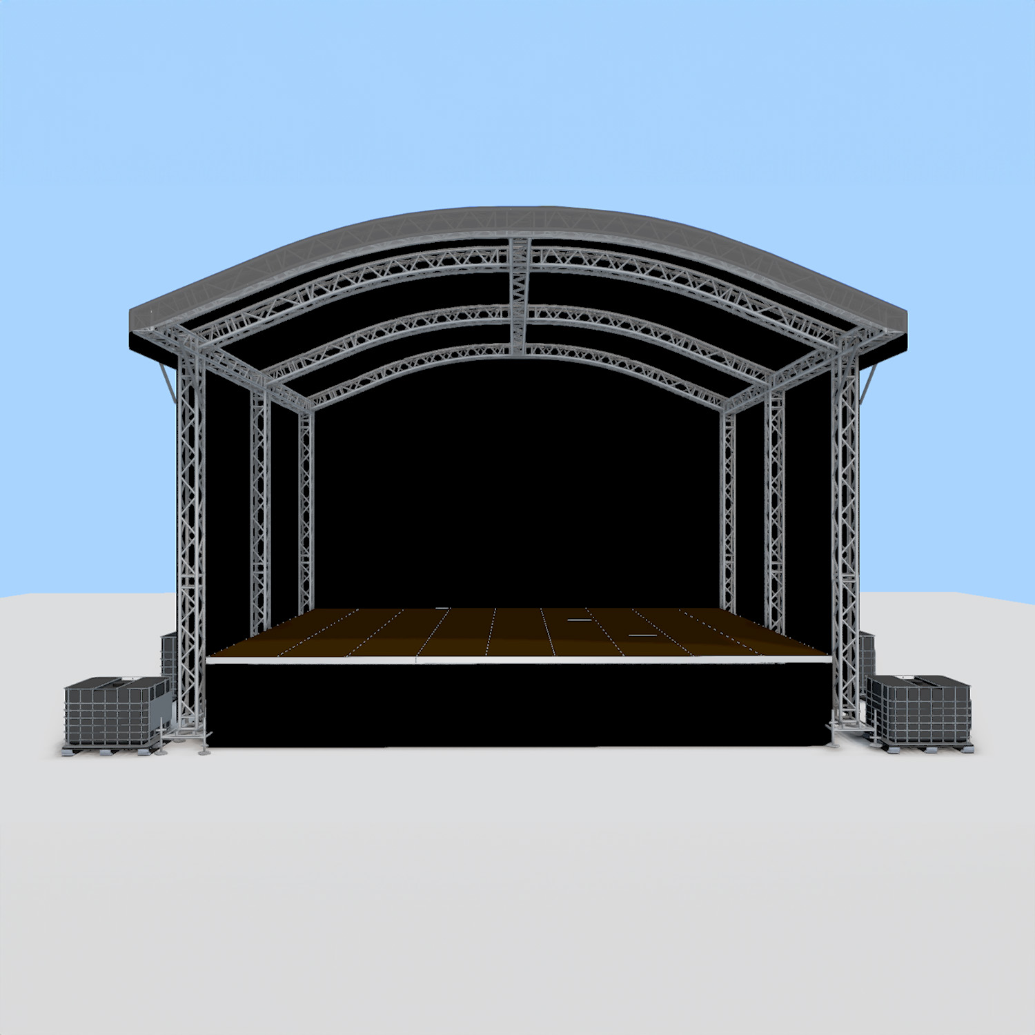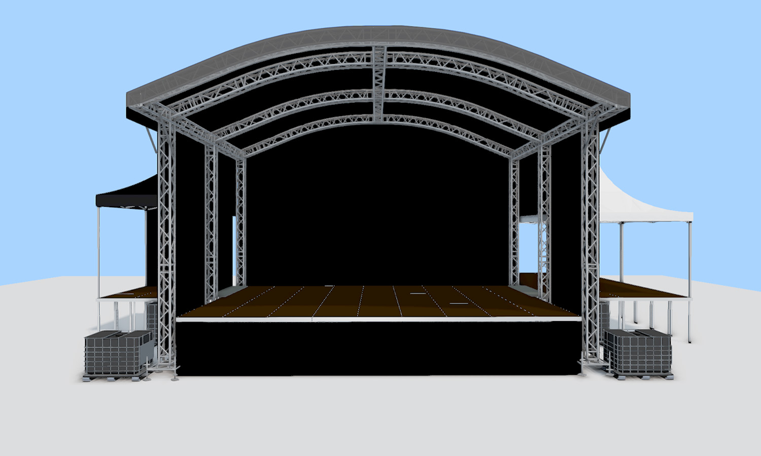 Het podium is optioneel te bestellen met backstageruimte en monitor-uitbouw.